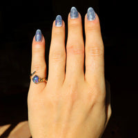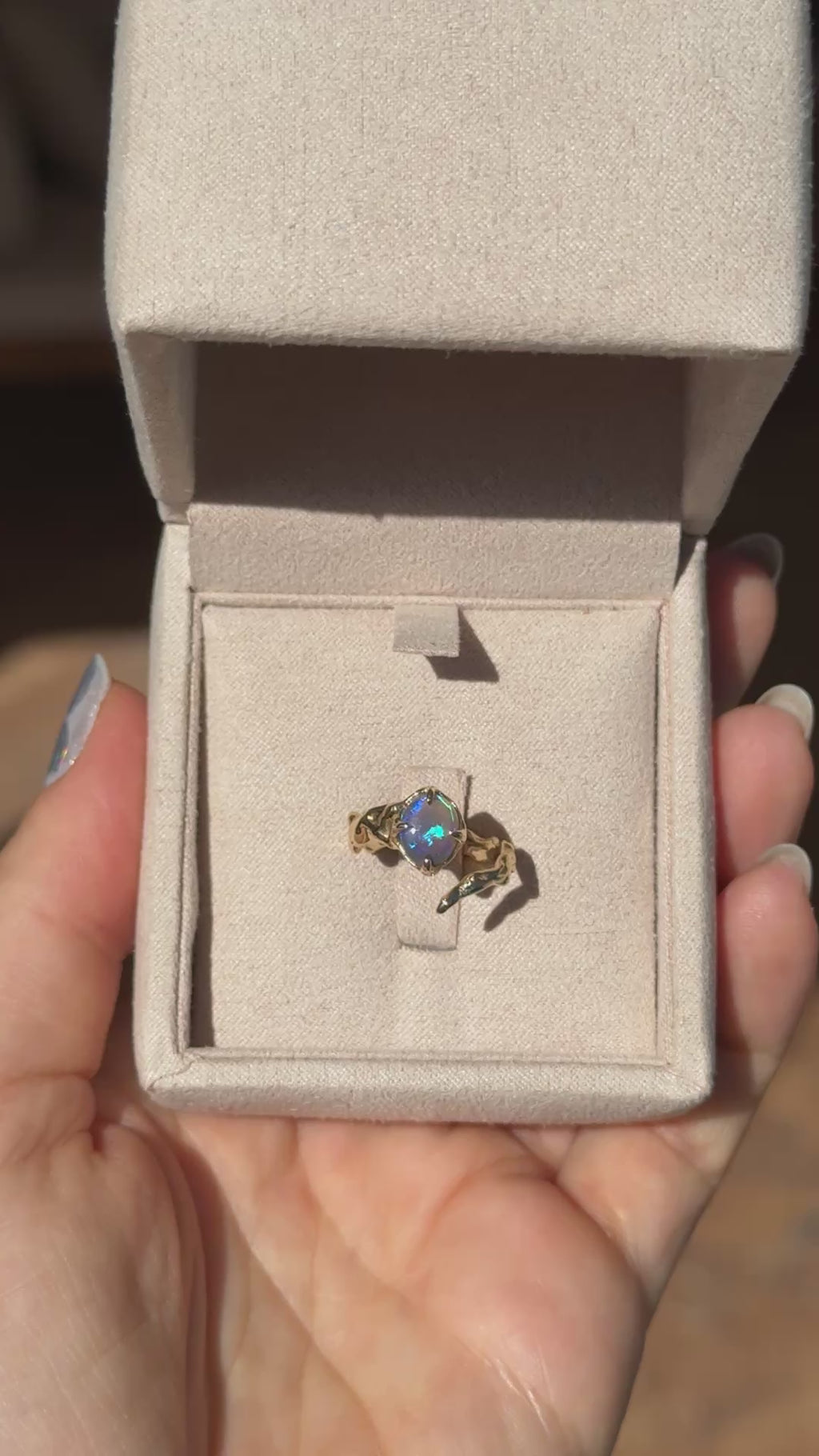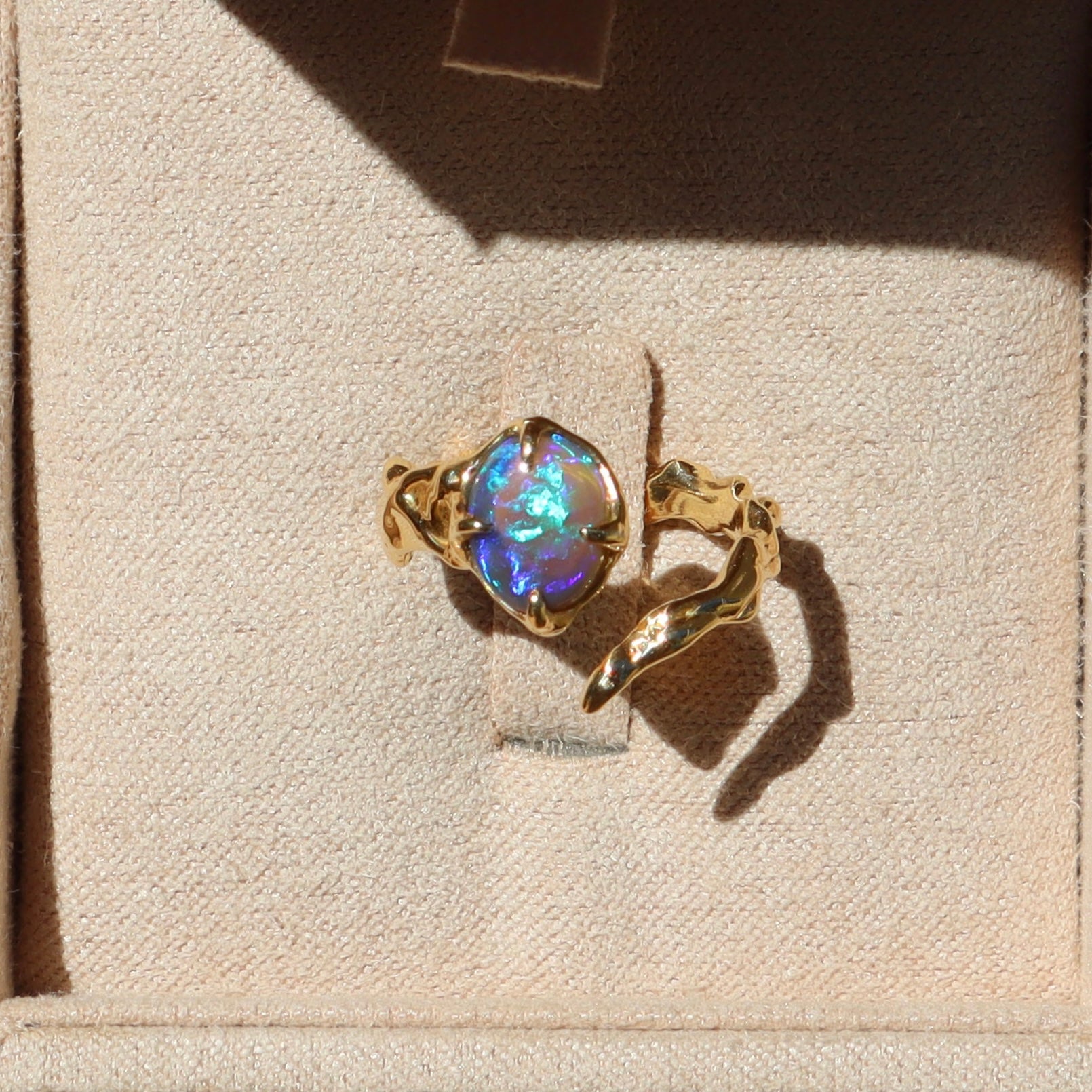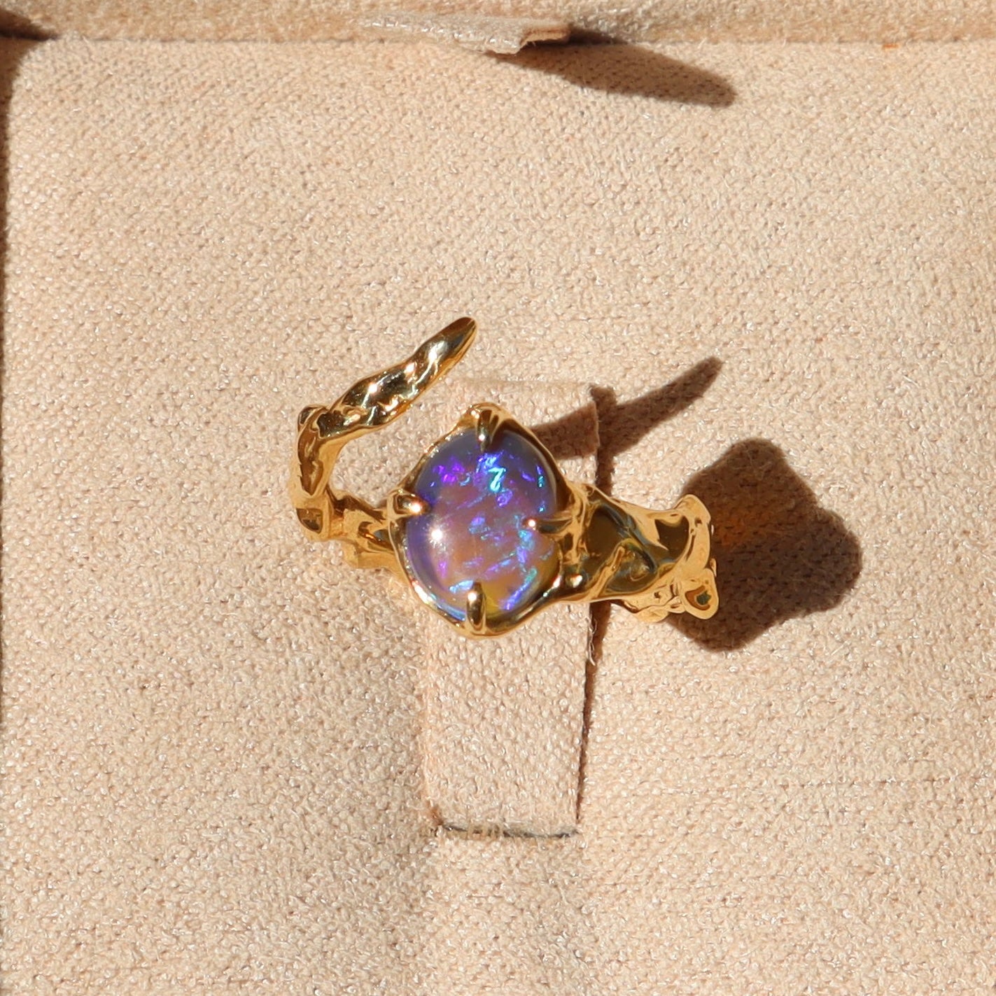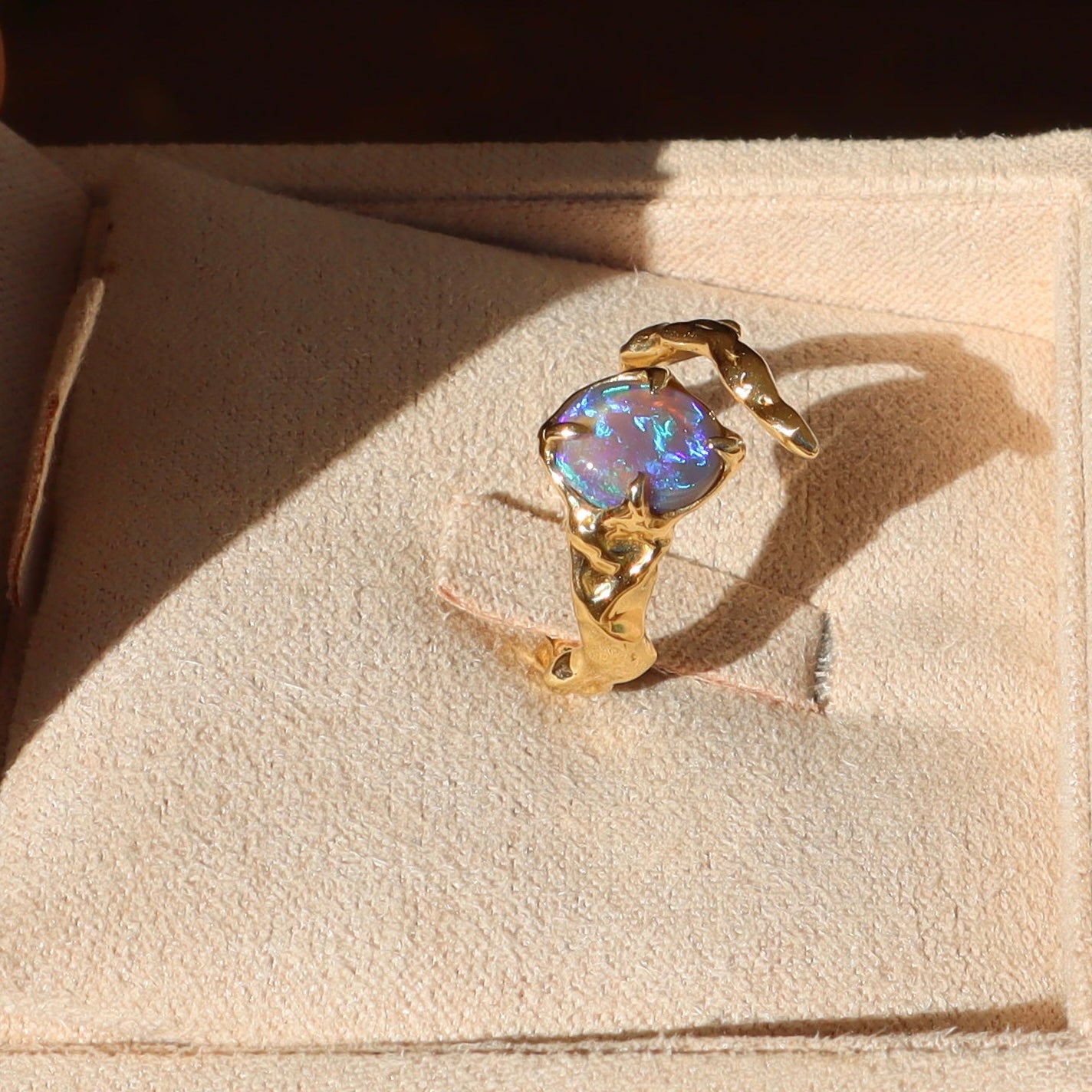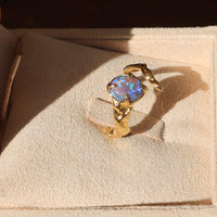 A .91ct flashy purple and green Australian Lightning Ridge crystal opal is set in a hand carved 14k yellow gold wrap around pinky ring.