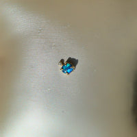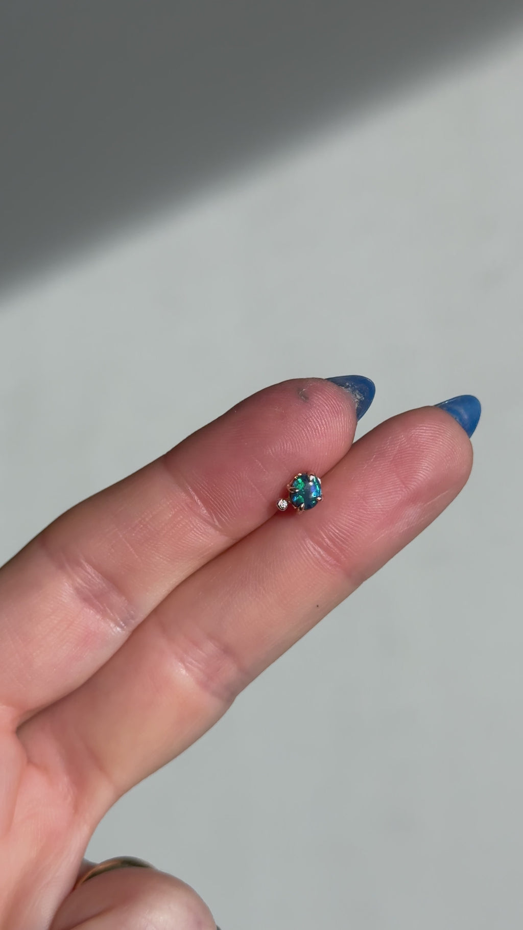 This gorgeous blue-green black opal from Lightning Ridge opal is set in a hand carved 14k yellow gold basket and sparkly white diamond accent.