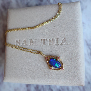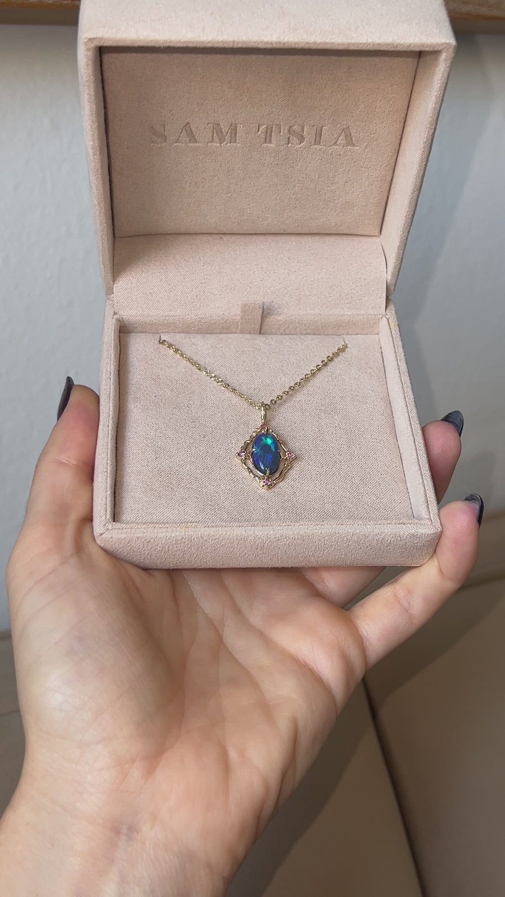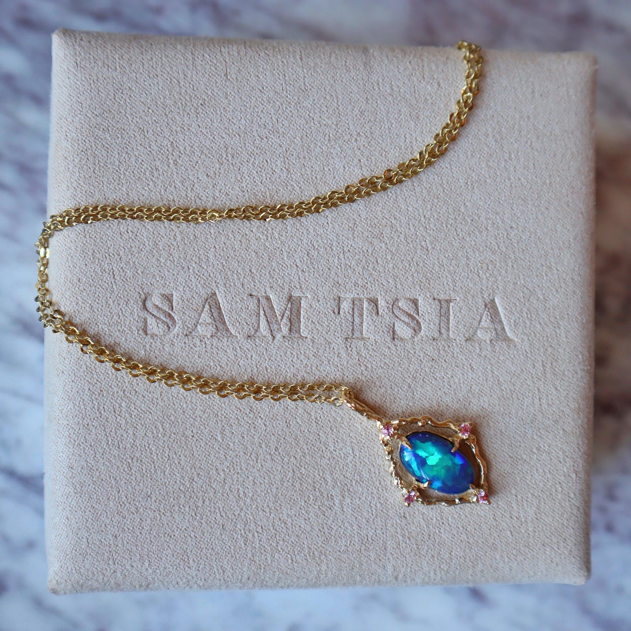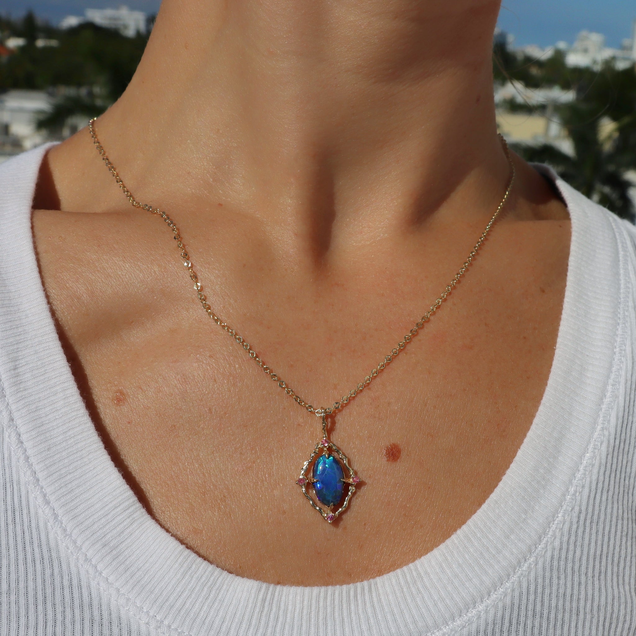 This bright 3.85ct blue green Australian opal is set in a hand carved 14k yellow gold textured diamond shaped setting with 4 pink sapphire accents.