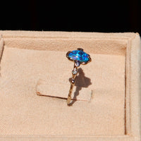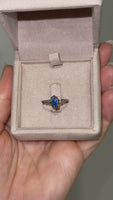 This adorable .59ct bright blue with green Australian black opal is set in a delicate hand carved 14k white gold band with four natural white FG VS diamonds.