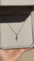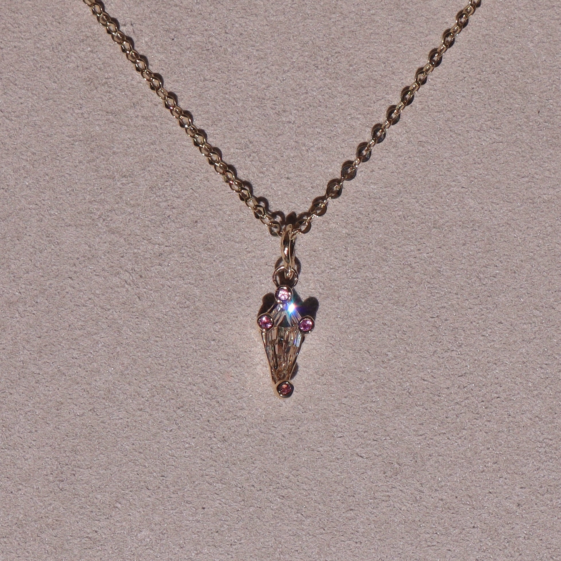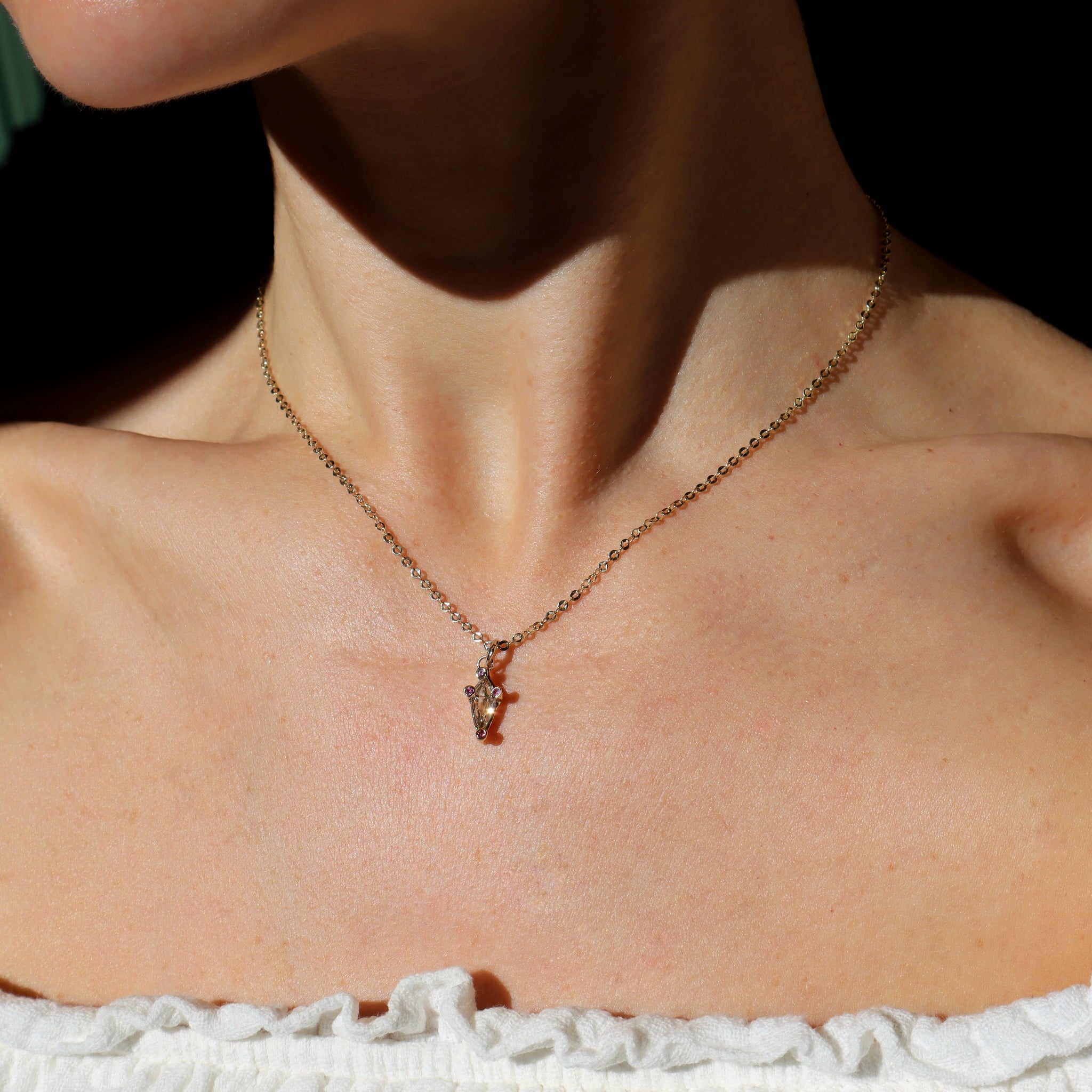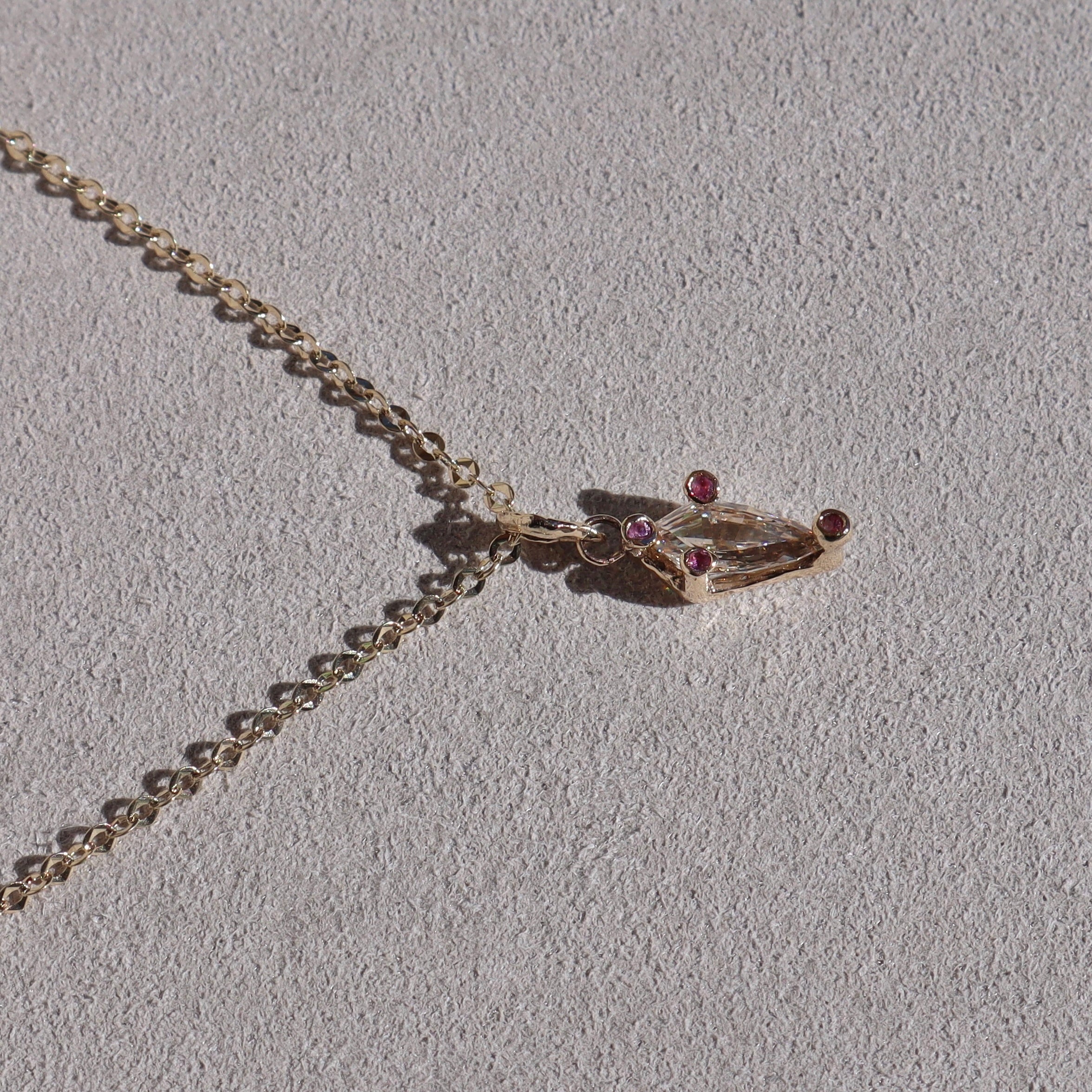 This stunning 1.00ct elongated geo-step cut kite shaped C2 VS2 champagne diamond is set in a 14k yellow gold setting with pink sapphire prongs.