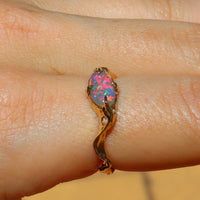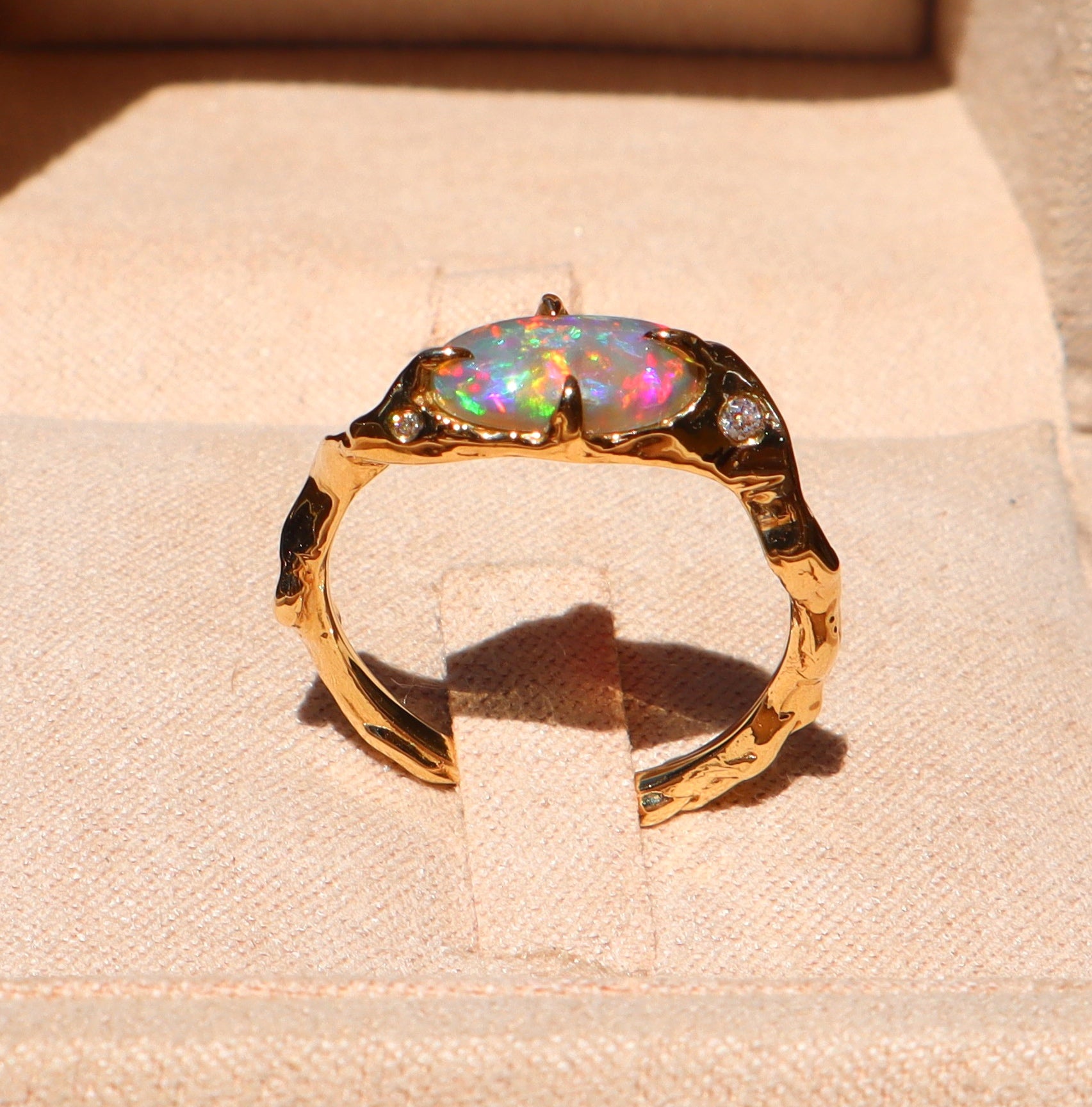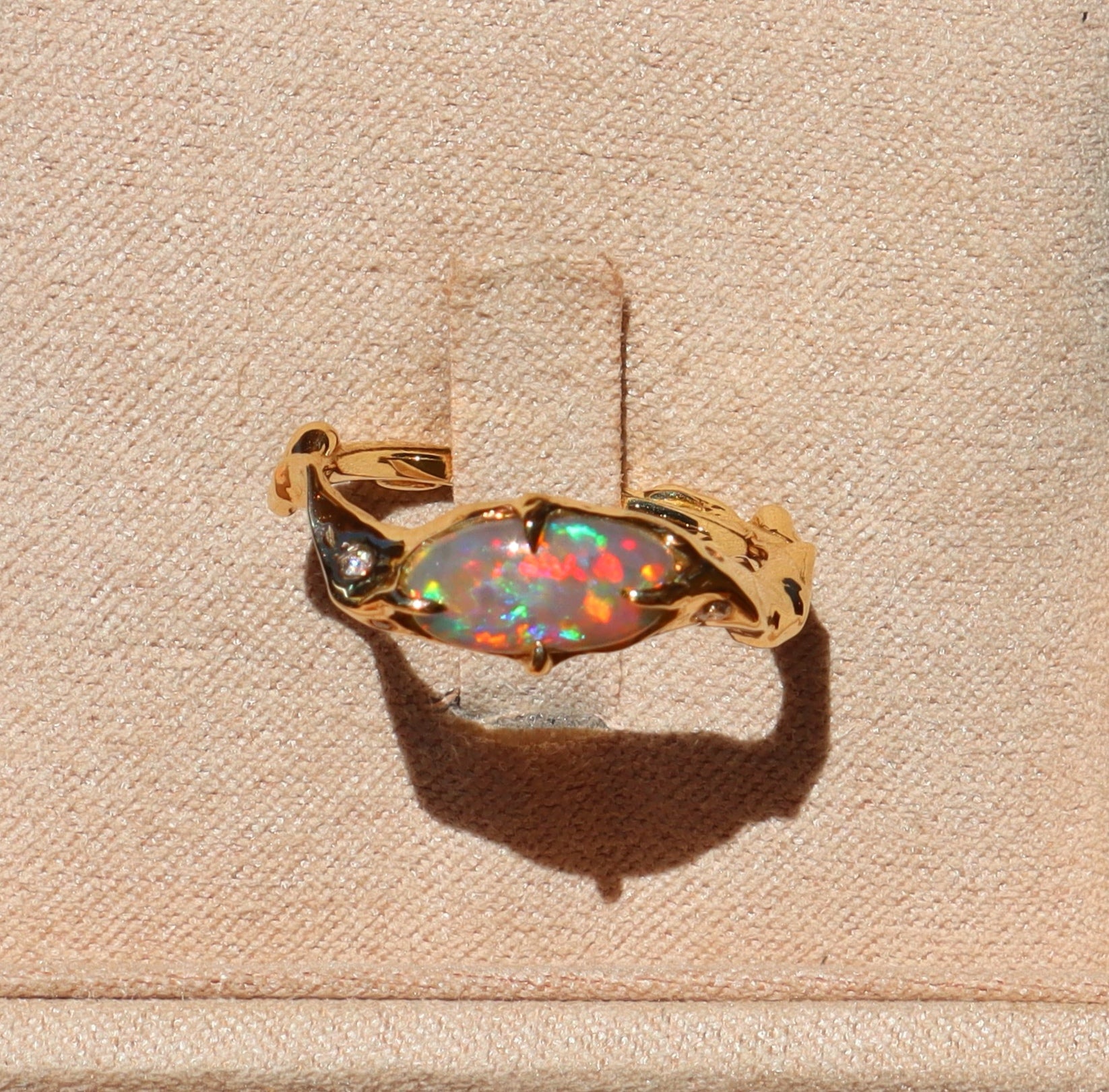 A bold multi colored .86ct coral-pink Australian opal is set in a hand carved 14k gold wavy band with 4 scattered diamonds.