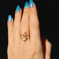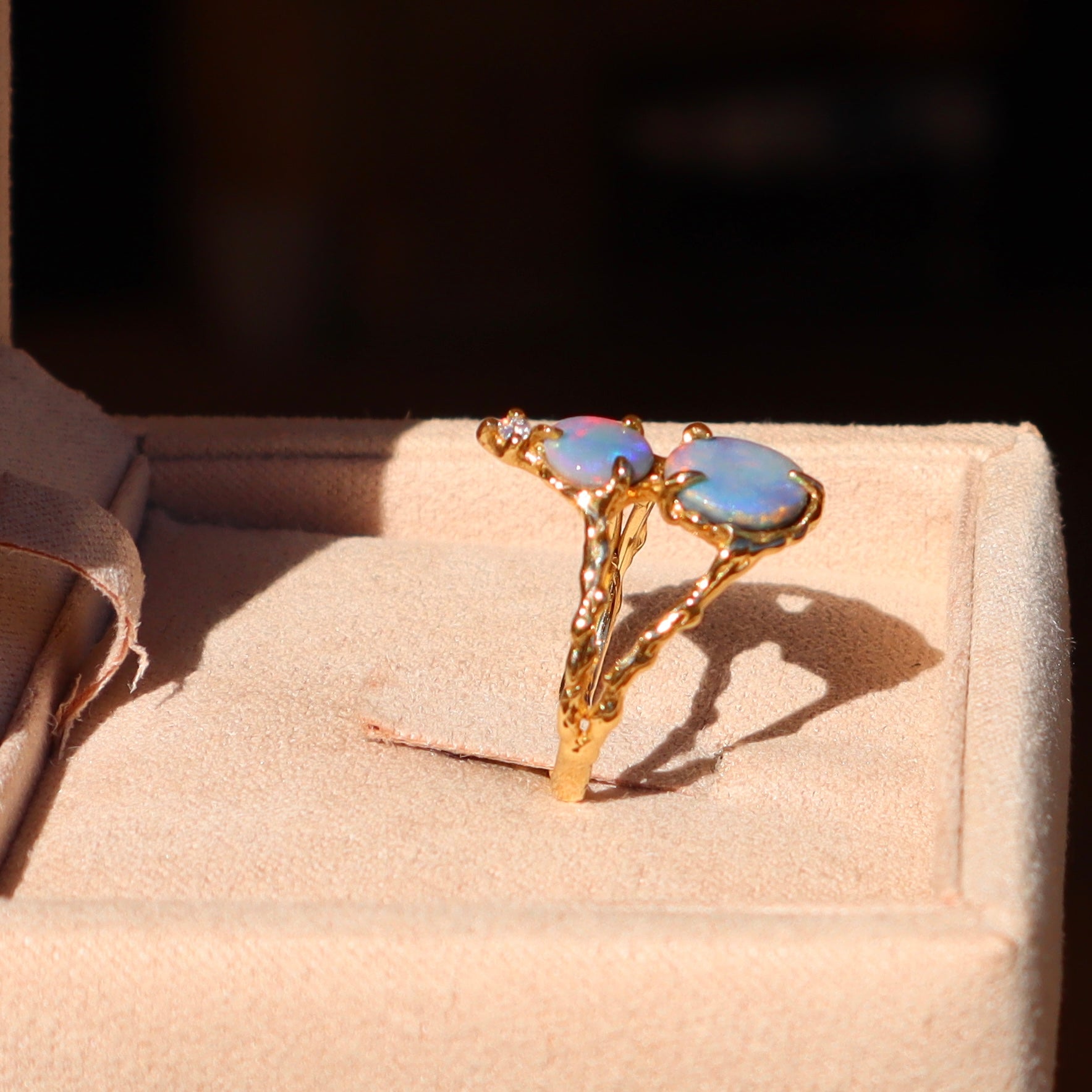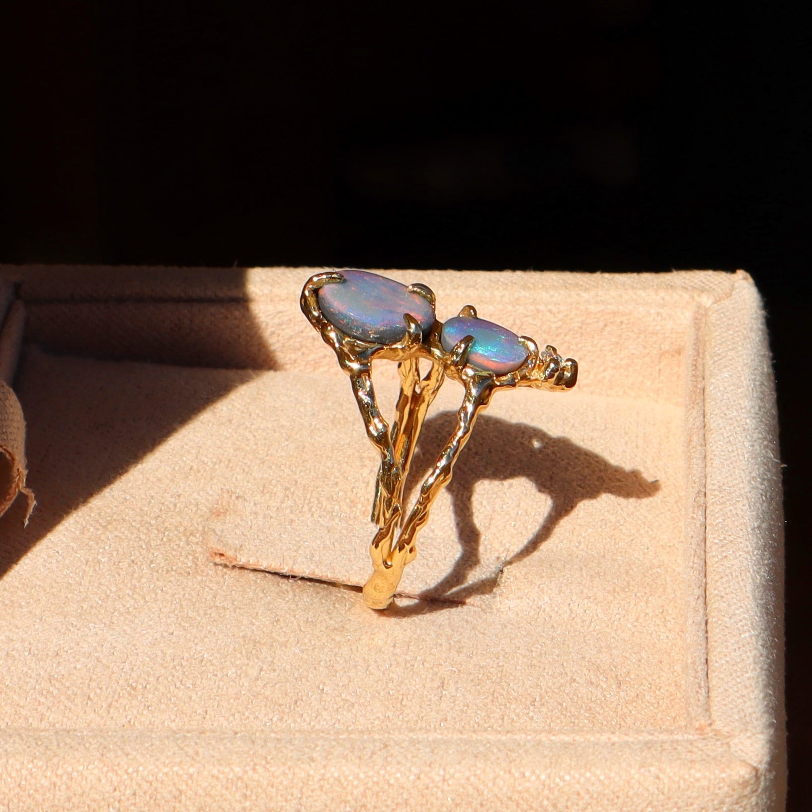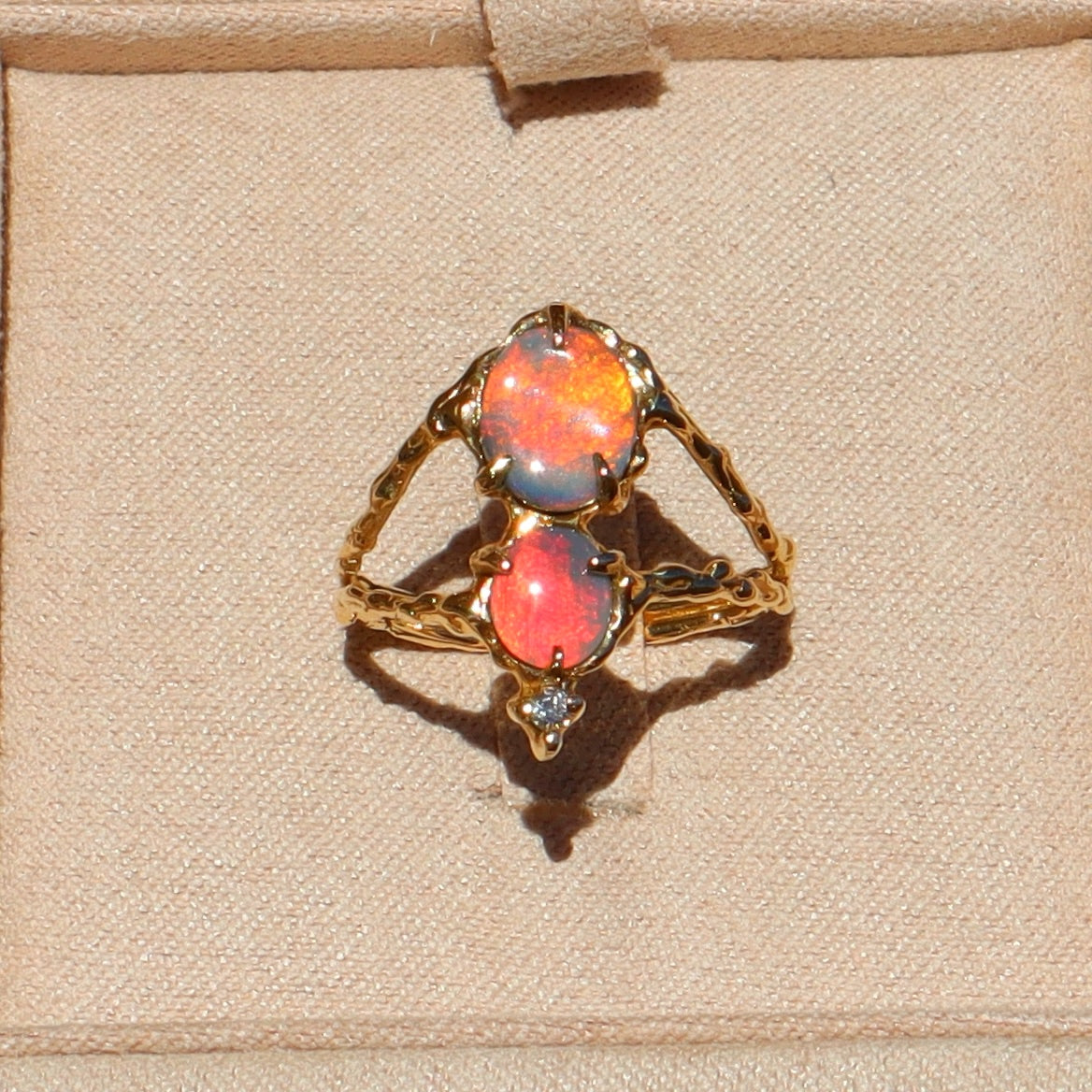 1.37 ctw matching red hot color changing Australian opals set in a handcarved 14k yellow gold ring with a diamond accent.