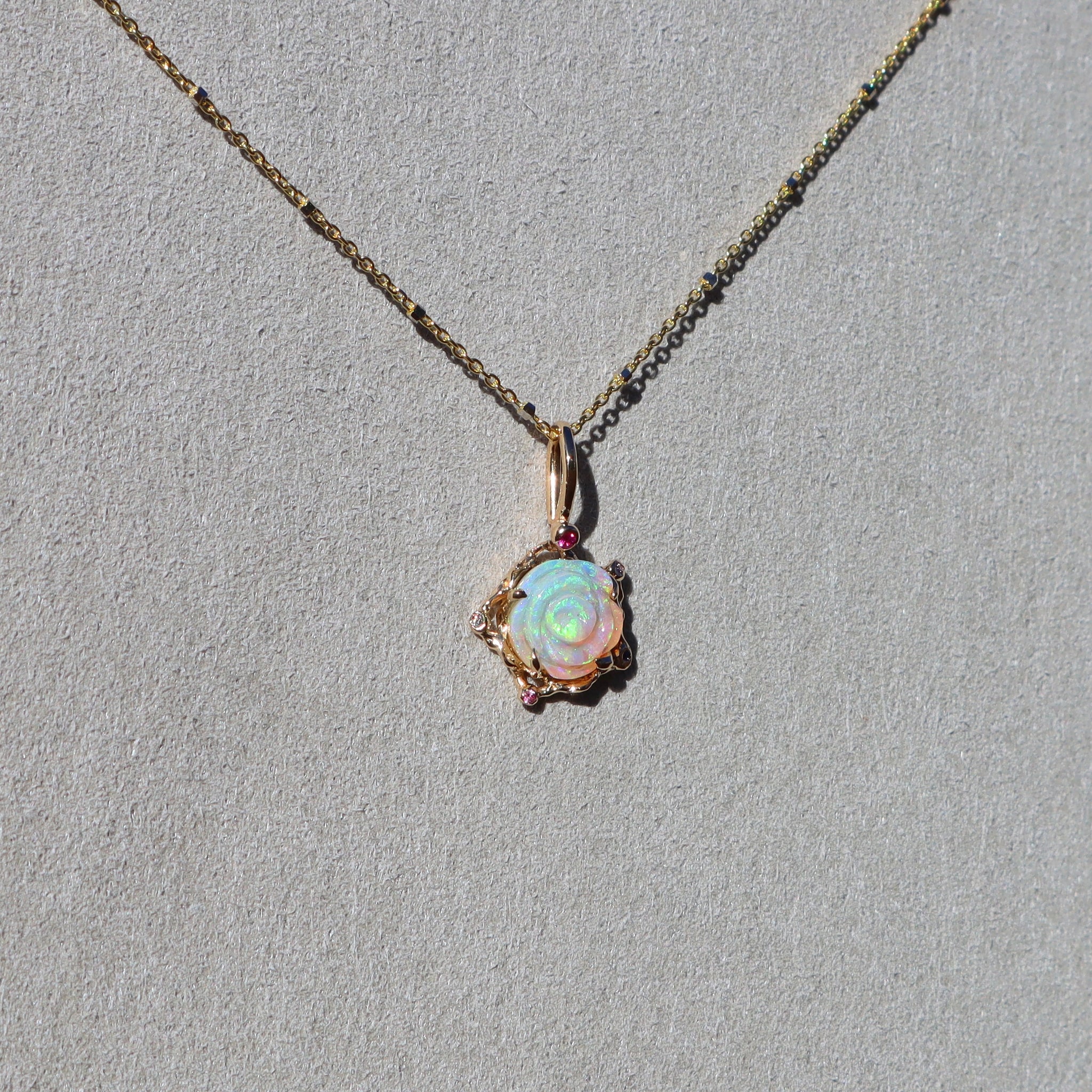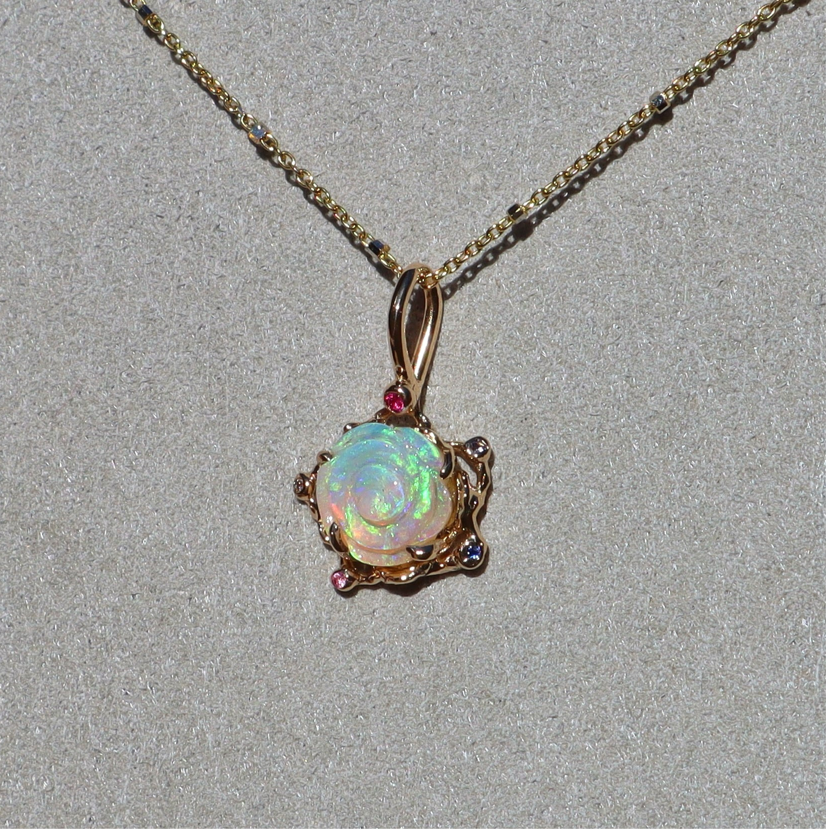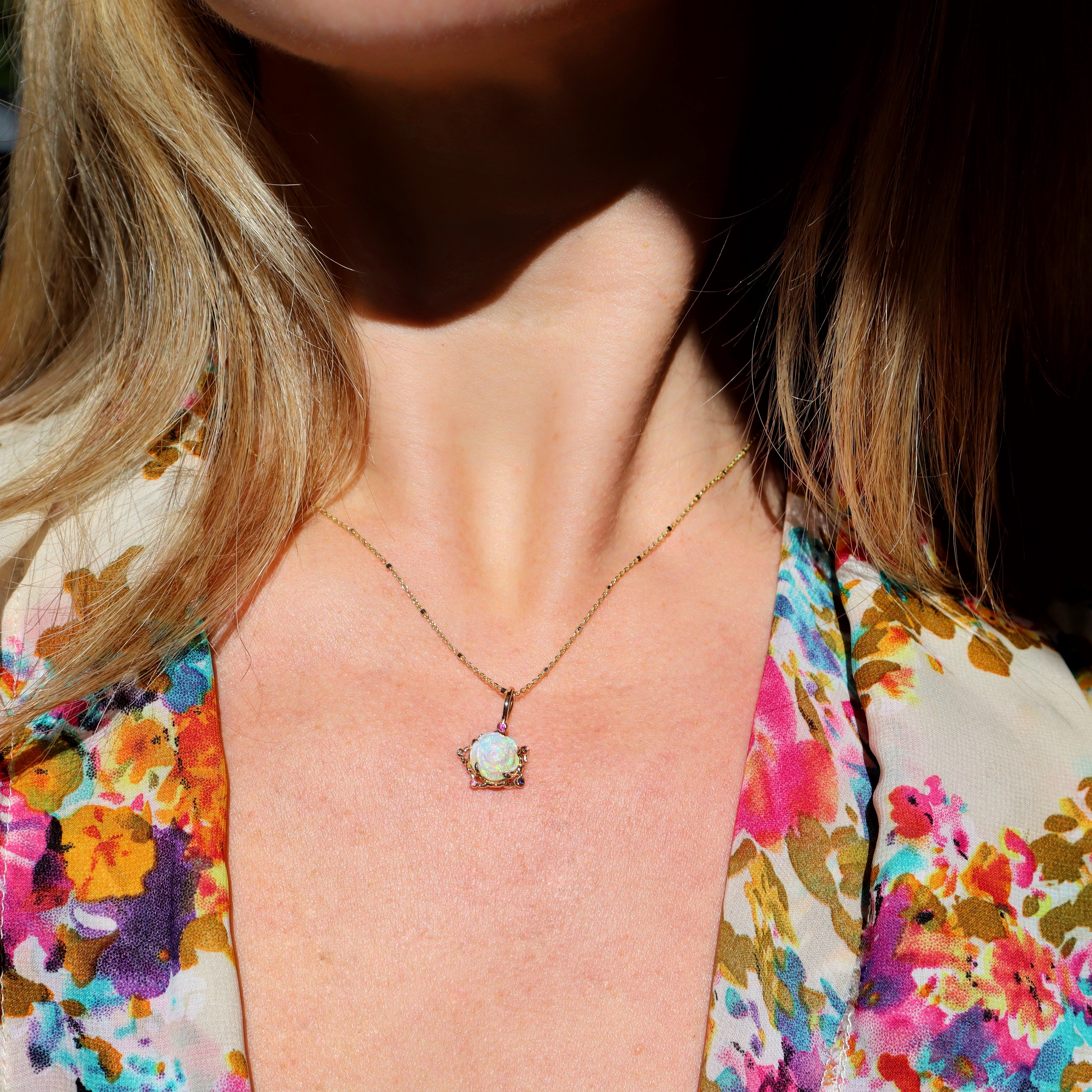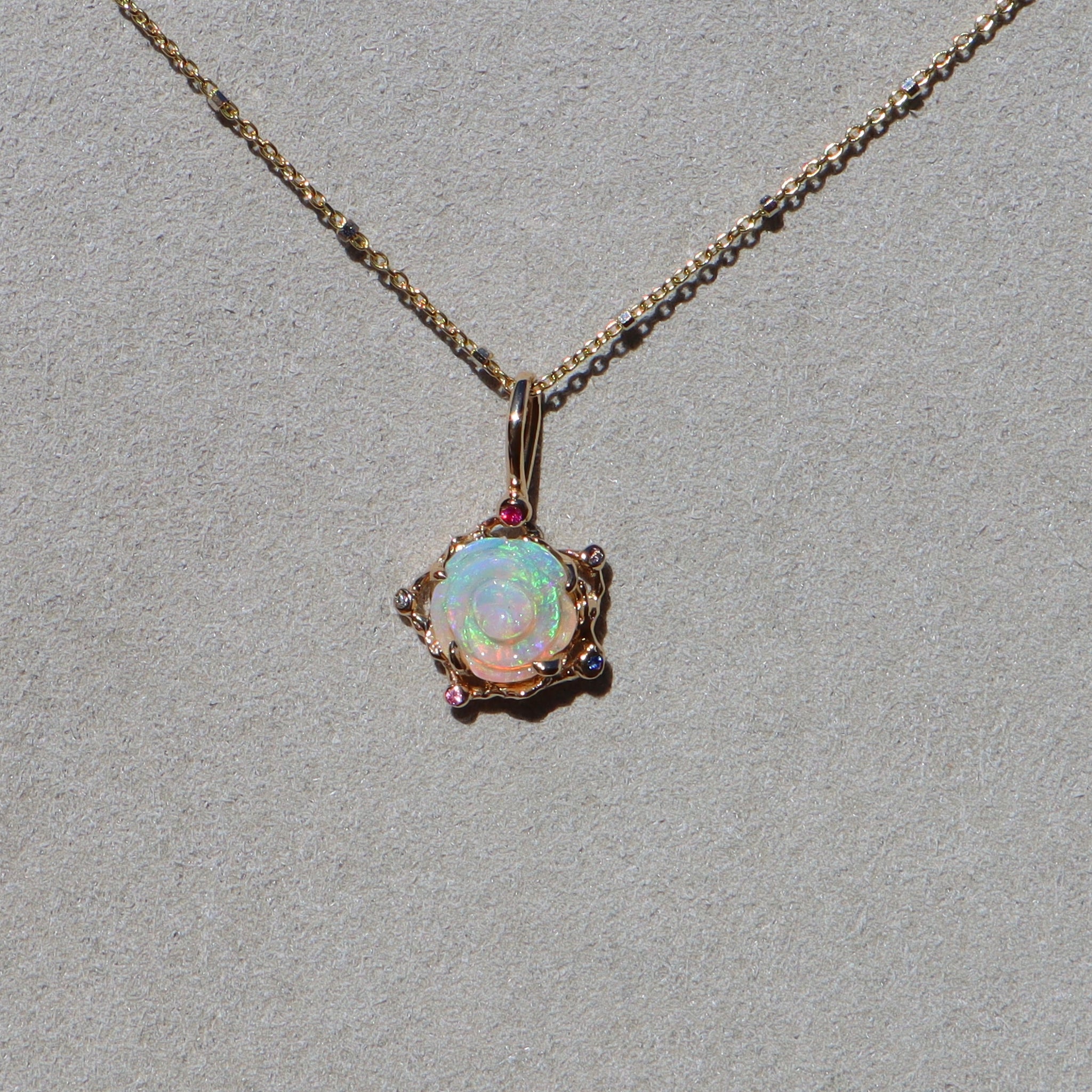 This 1.36ct flashy green Australian Queensland crystal opal heart has been hand carved into a beautiful little flower and set in a 14k yellow gold rosette style necklace adorned with pink, purple and blue sapphires and  diamond.
