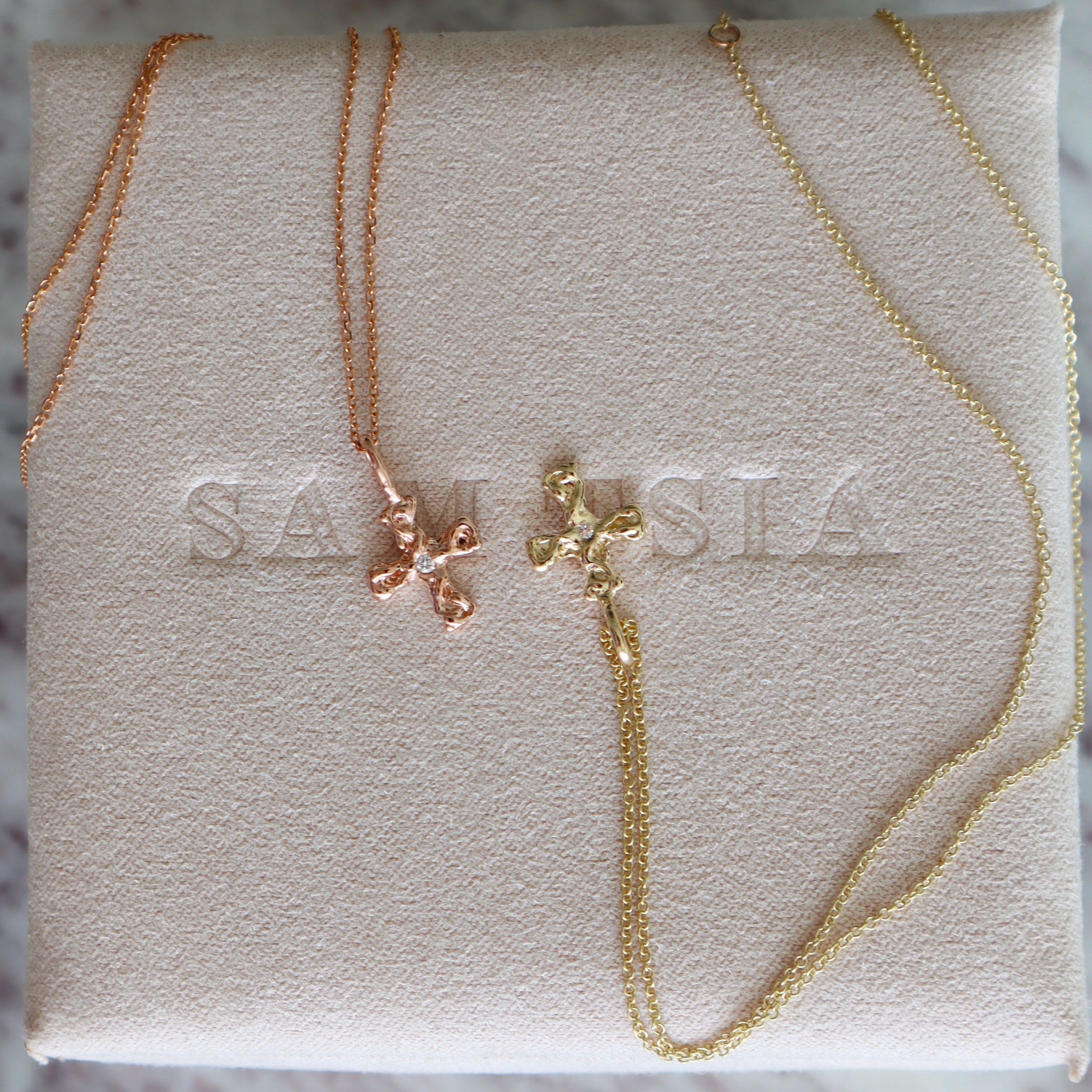 This 14k gold and diamond cross was delicately hand carved and finished for a perfectly organic and beautiful twist on your classic every day cross.