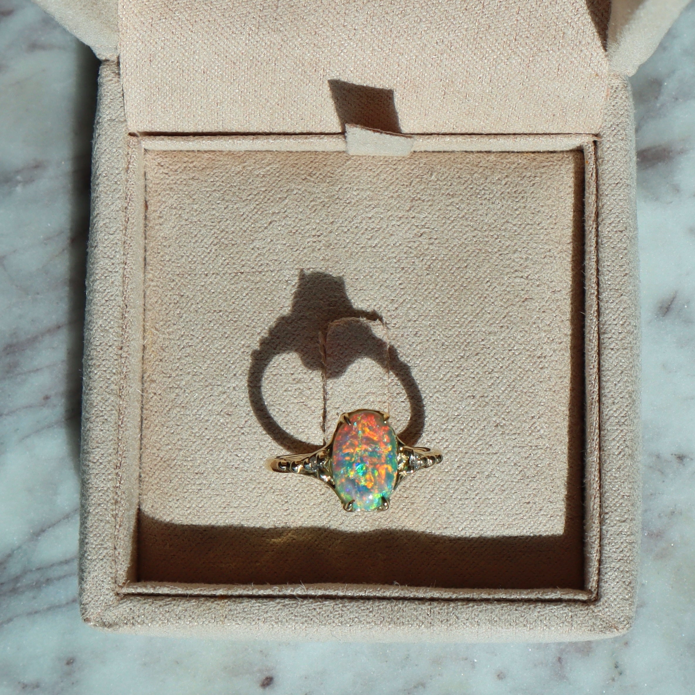 This bright rainbow colored 1.32ct Australian Opal oval is set in a hand carved 14k yellow gold ring with two white diamonds accents.14k yellow gold.
