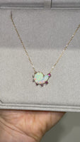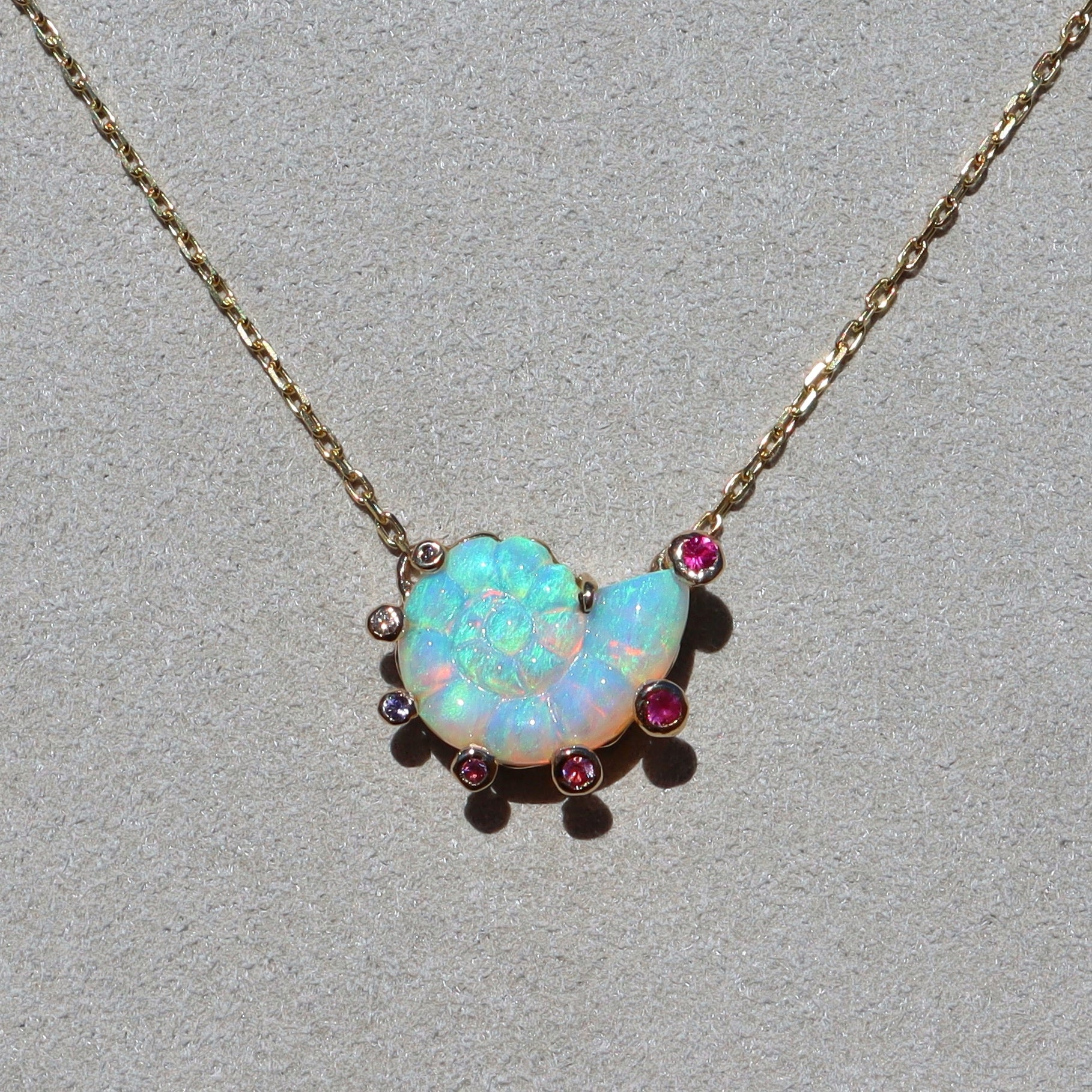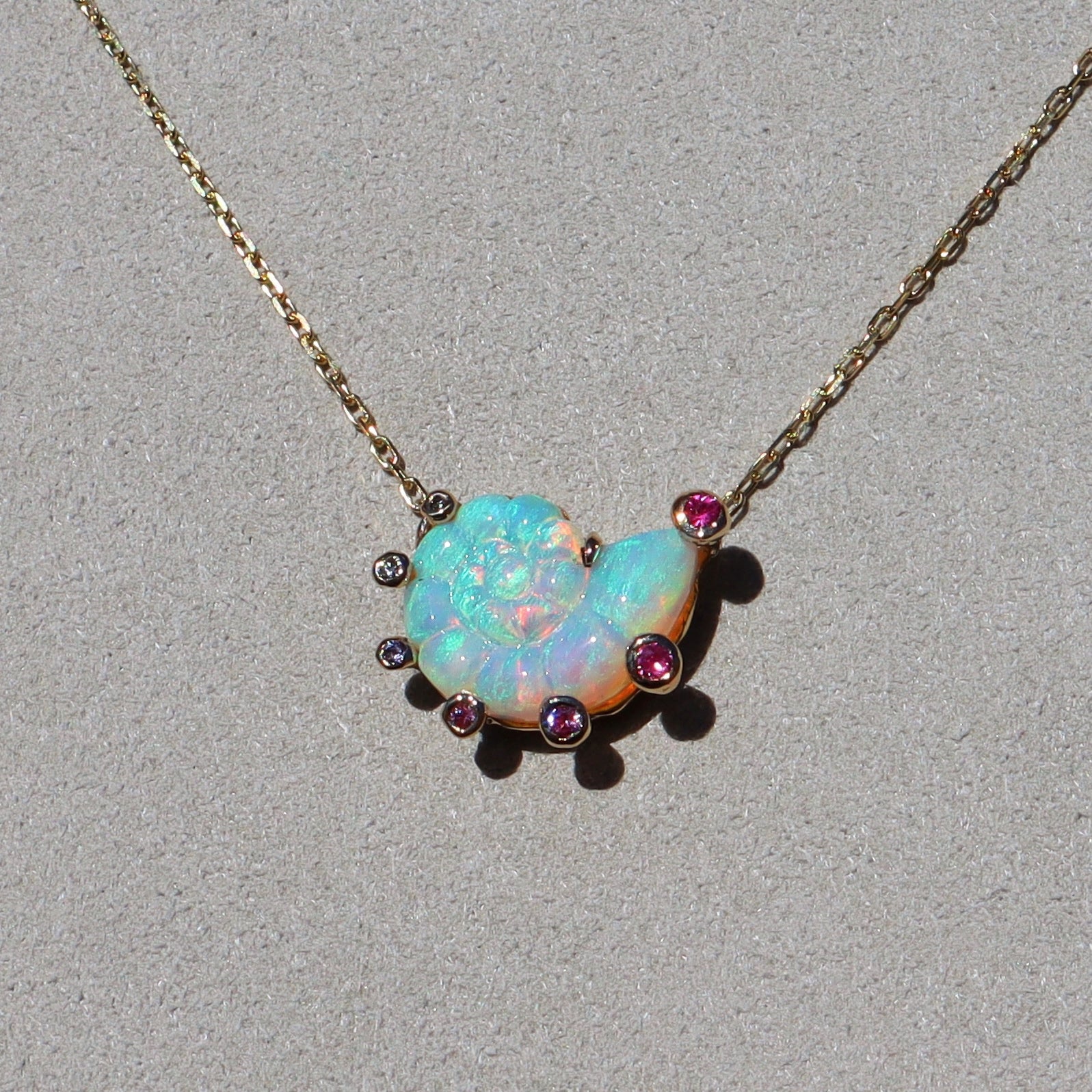This 6.28ct gorgeous glowing aqua green and orange Queensland opal is hand carved into an intricate nautilus and then hand carved again into one of a kind 14k gold necklace with ombre pink and purple sapphires and diamonds.