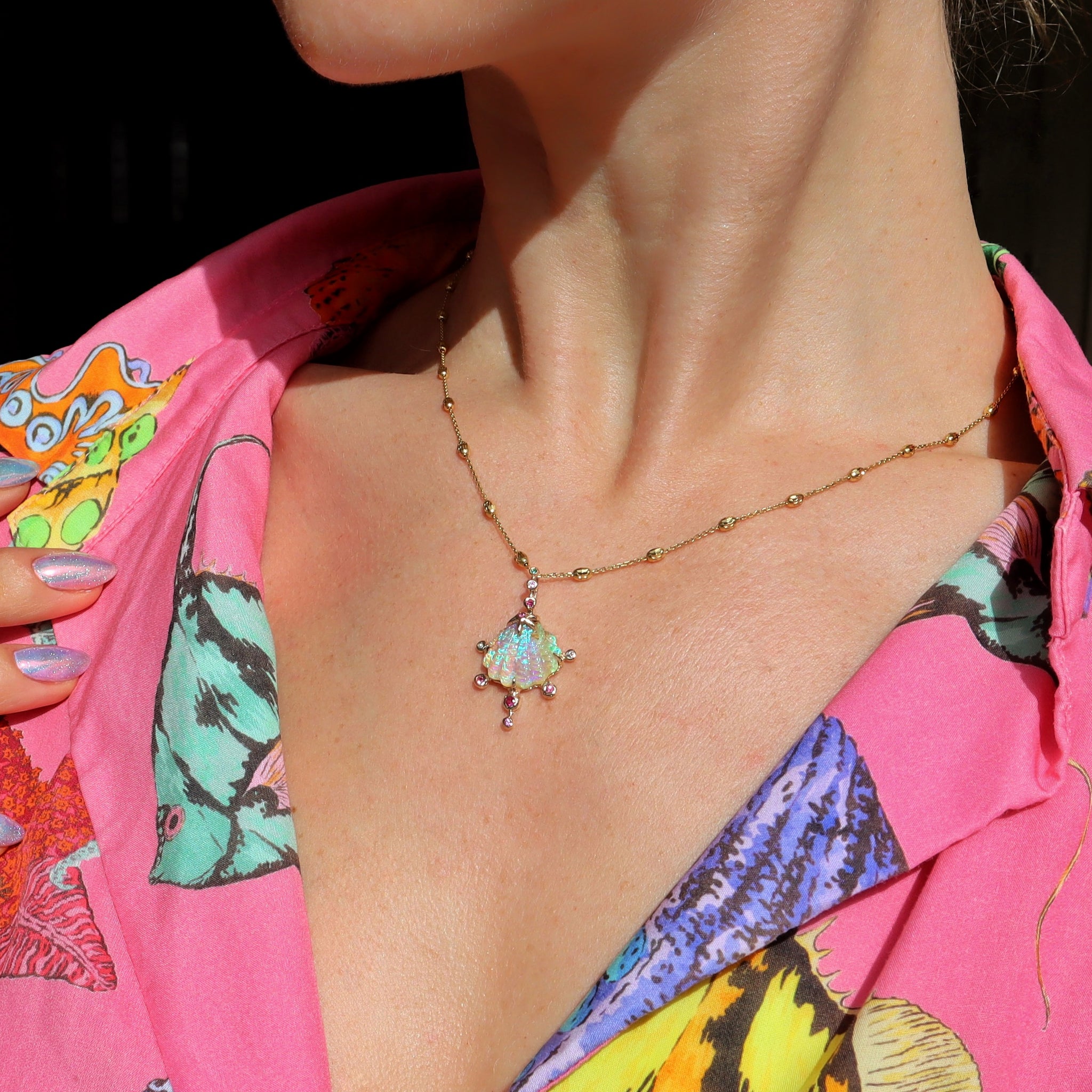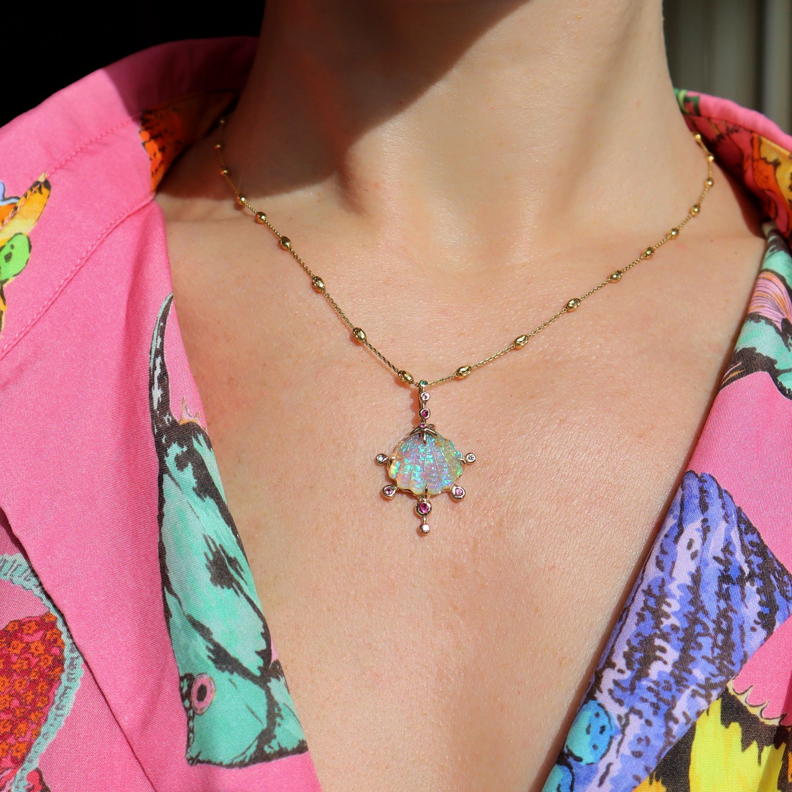 This 5.12ct flashy green purple and blue Queensland opal is hand carved into an intricate sea shell and then hand carved again into one of a kind 14k gold necklace with ombre pink sapphires FG VS diamond and emerald.