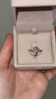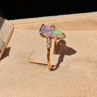 This fun .83ct multi colored “confetti” Lightning Ridge crystal opal is set in a hand carved 14k yellow gold band with two .14ctw natural white diamond baguettes.