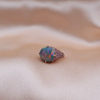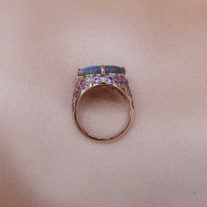 5.05ct Australian Black Opal set in a custom 18k rose gold pavè setting with pink + purple sapphires and white diamonds.