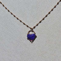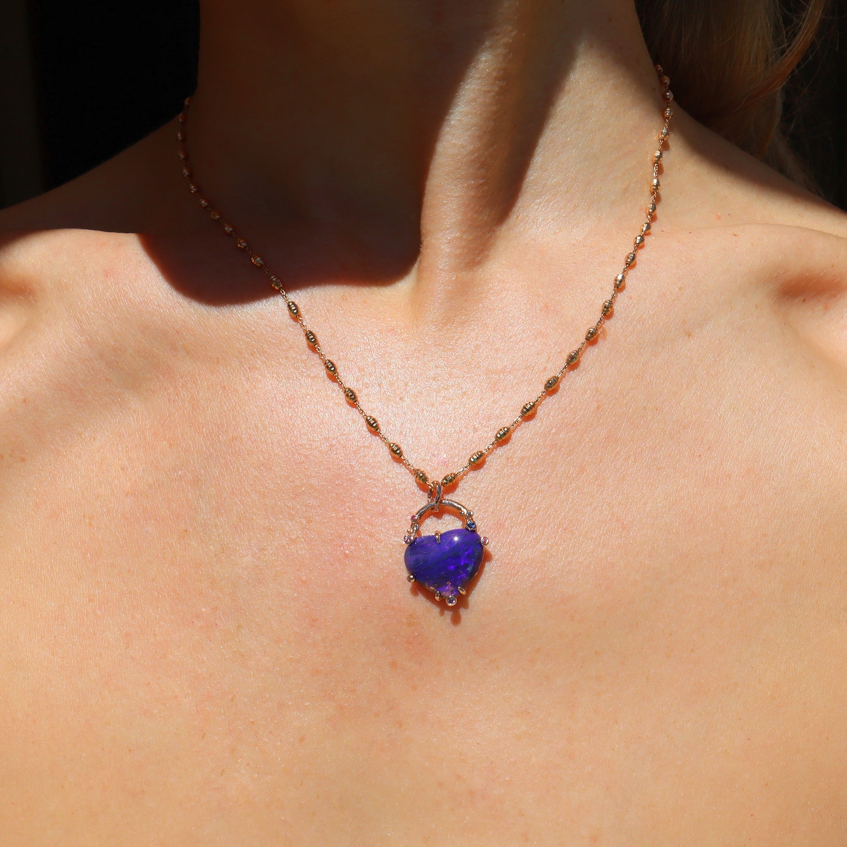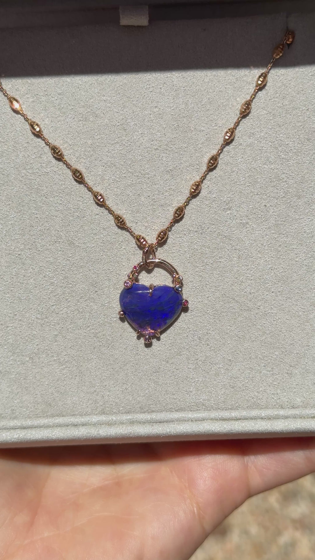 5.1ct vivid purple Australian opal heart in a hand carved 14k rose gold padlock style necklace adorned with pink, purple and blue sapphires and diamonds.