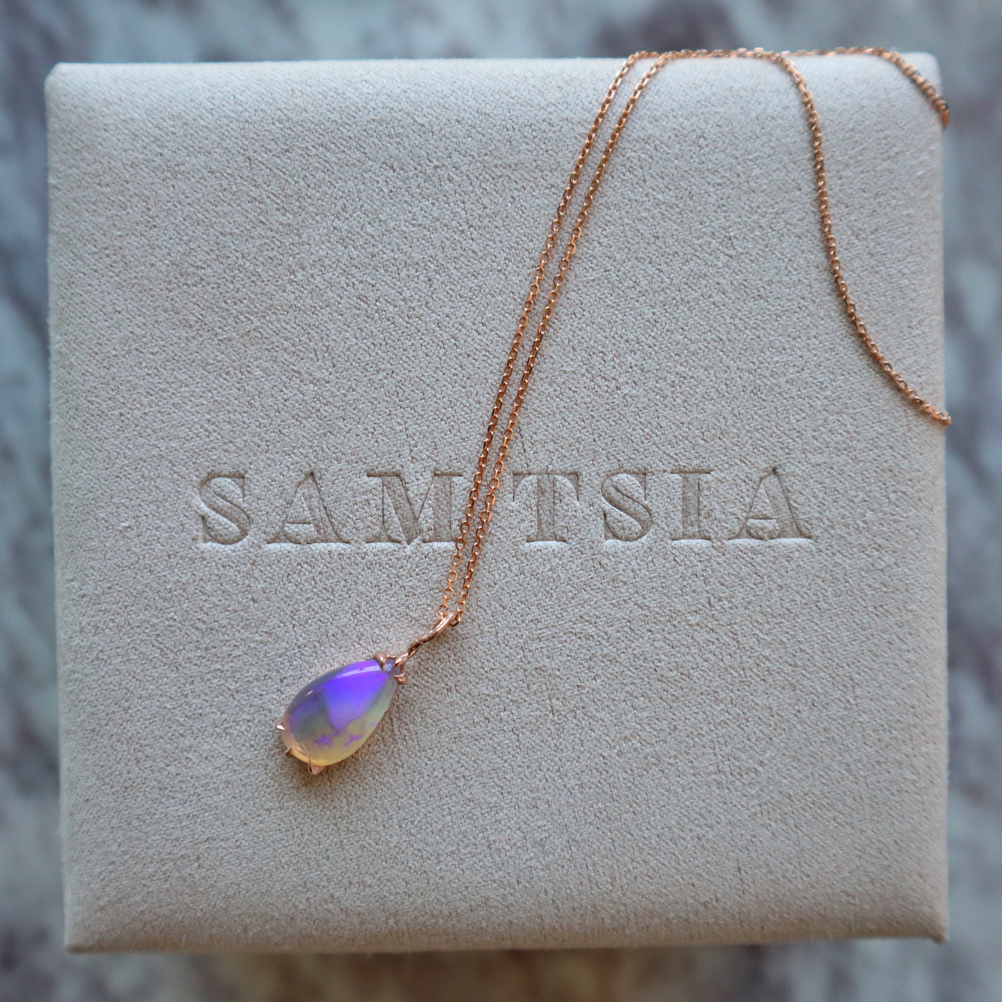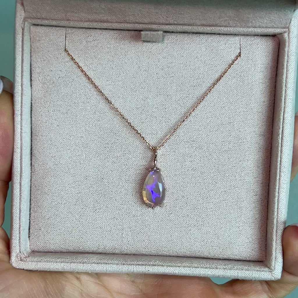 This beautiful 1.32ct fluorescent purple Australian opal is set in a hand carved 14k rose gold claw setting.