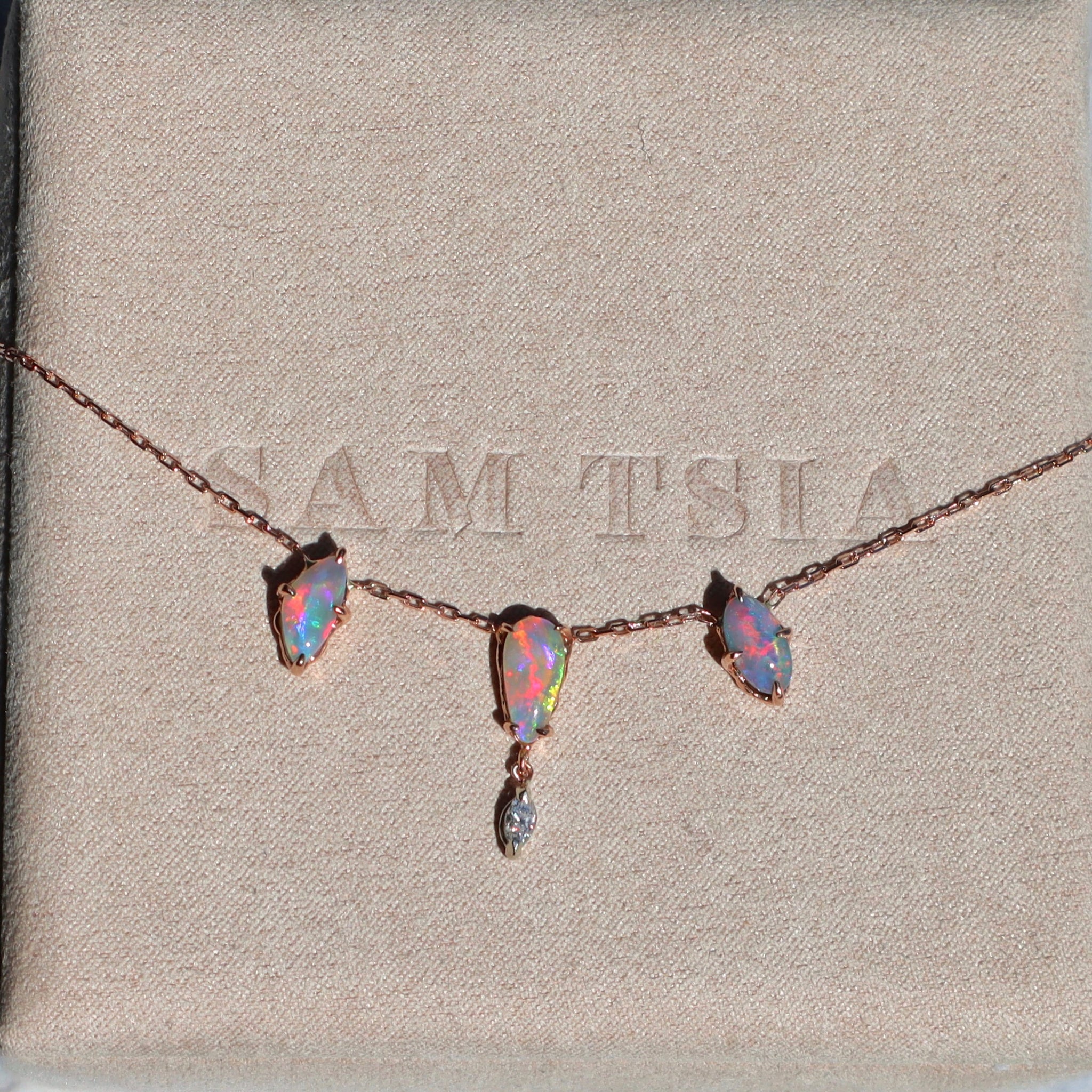 2.84ctw gorgeously bright rainbow colored Australian Lightning Ridge Opal layout set in hand carved 14k rose gold necklace and .15ct white diamond marquis in white gold basket setting.